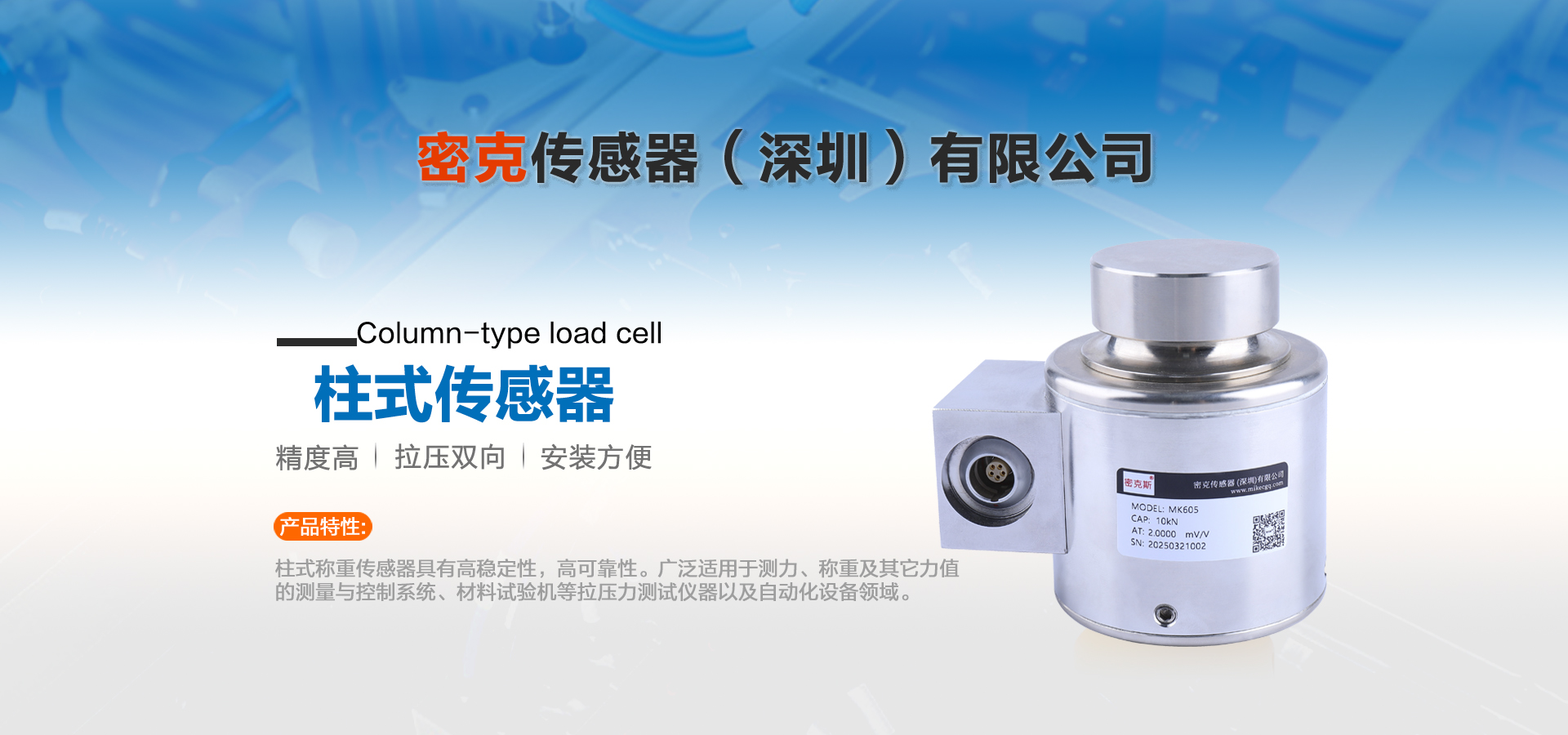 密克傳感器(深圳)有限公司主要生產(chǎn)的產(chǎn)品有測力傳感器、稱重傳感器、拉力傳感器、壓力傳感器、扭矩傳感器,多維力傳感器,電子引伸計等各類力學和稱重傳感器、及其配套儀器儀表和模塊附件的工廠。